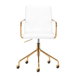 Design raffinato e alta praticità Il rivestimento in ecopelle bianca di alta qualità conferisce alla sedia una sensazione piacevole al tatto e una notevole resistenza, oltre a renderla semplice da pulire e mantenere nel tempo. La base metallica color oro, elegante e robusta, si sposa perfettamente con la linea sobria e moderna della sedia. Dotata di ruote funzionali, la sedia è facilmente trasportabile all’interno degli ambienti, garantendo massima mobilità e praticità d’uso.