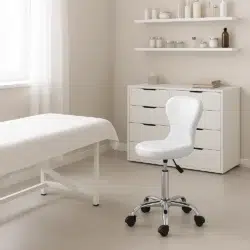 Lo sgabello con schienale è l’accessorio ideale per garantire comfort e supporto durante i trattamenti in centro estetico o in salone da parrucchiere. Disponibile nei colori nero o bianco, si adatta perfettamente a qualsiasi ambiente professionale, unendo stile e funzionalità.