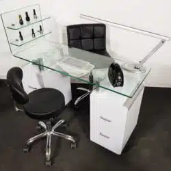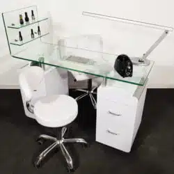 Tavolo manicure della Keopalia dotato di mensole in vetro per l’esposizione dei prodotti.